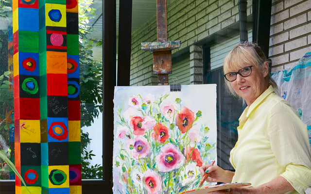 Ihr bevorzugtes Motiv sind Blumen in ihren vielfältigen Variationen, prachtvoll und farbenfroh,